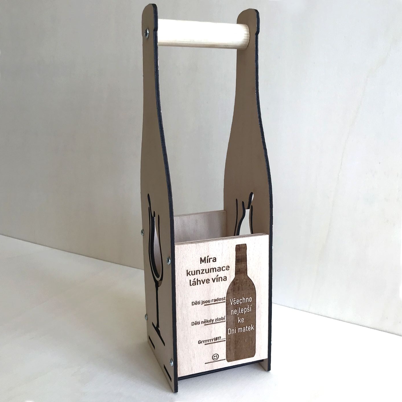 Dřevěná bedýnka na víno ke Dni matek. Do bedýnky pasují všechny běžné druhy lahví (o maximálním průměru 100mm a výšce 330mm). Lahev s vínem není součástí produktu. Vhodný dárek ke Dni matek pro milovnice vína. :-)