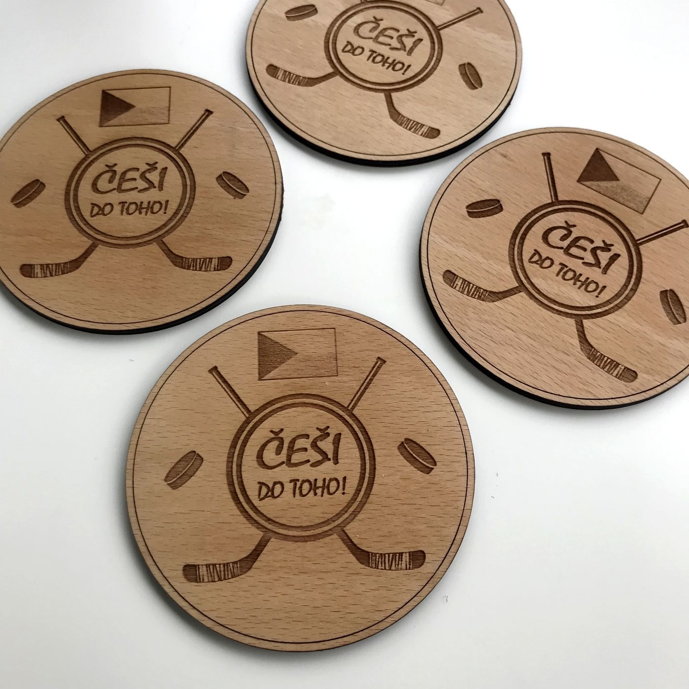 Podtácky s hokejovou tématikou. Na podtácky Vám vyrobíme text podle Vašeho přání. Můžete si zvolit jestli chcete 4 nebo 6 kusů a jestli bude sada se stojánkem nebo bez stojánku. :-)