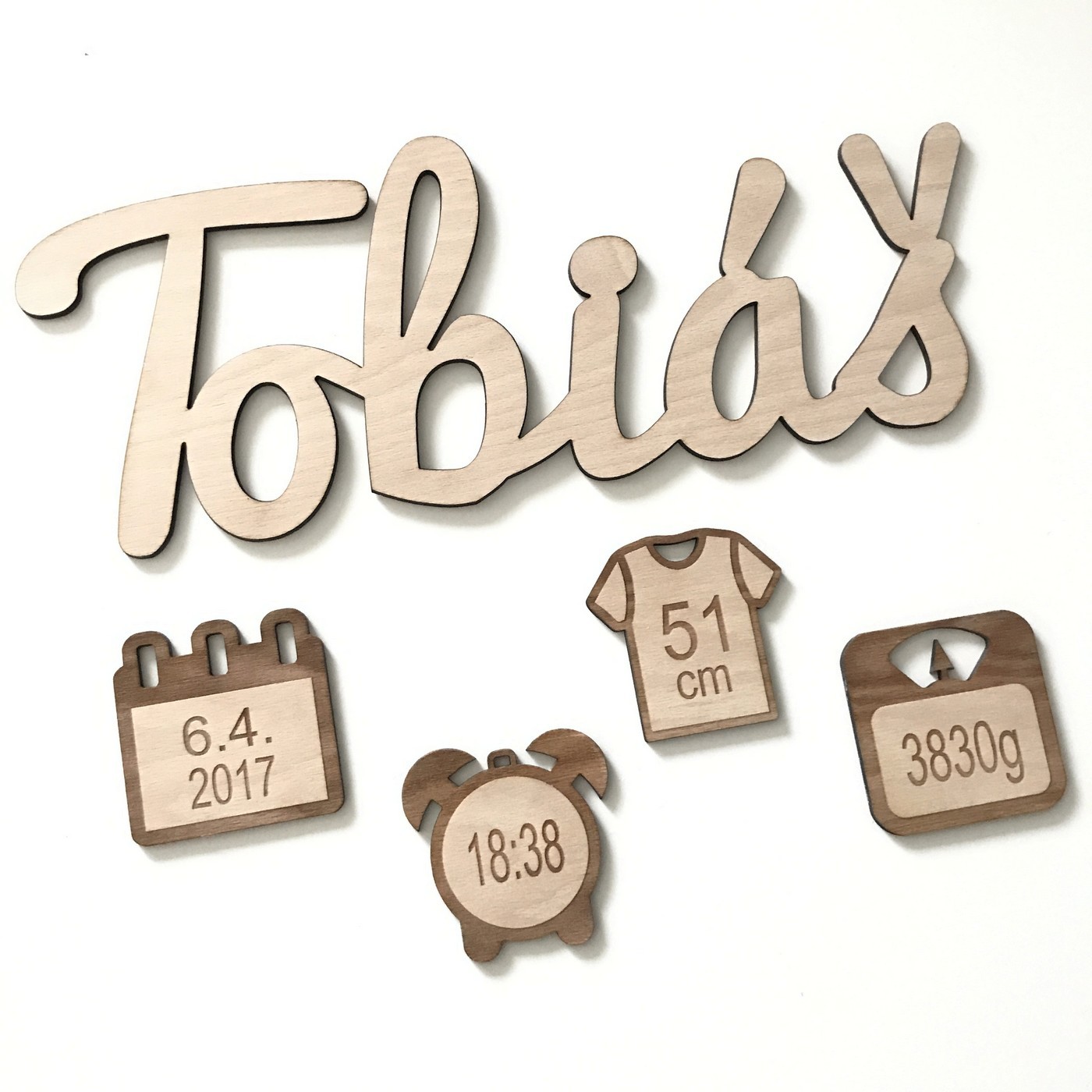 Dárek k narození dítěte - dekorace s porodními údaji. Velikost jména cca 40x17cm. Velikost ozdob 8x8cm.