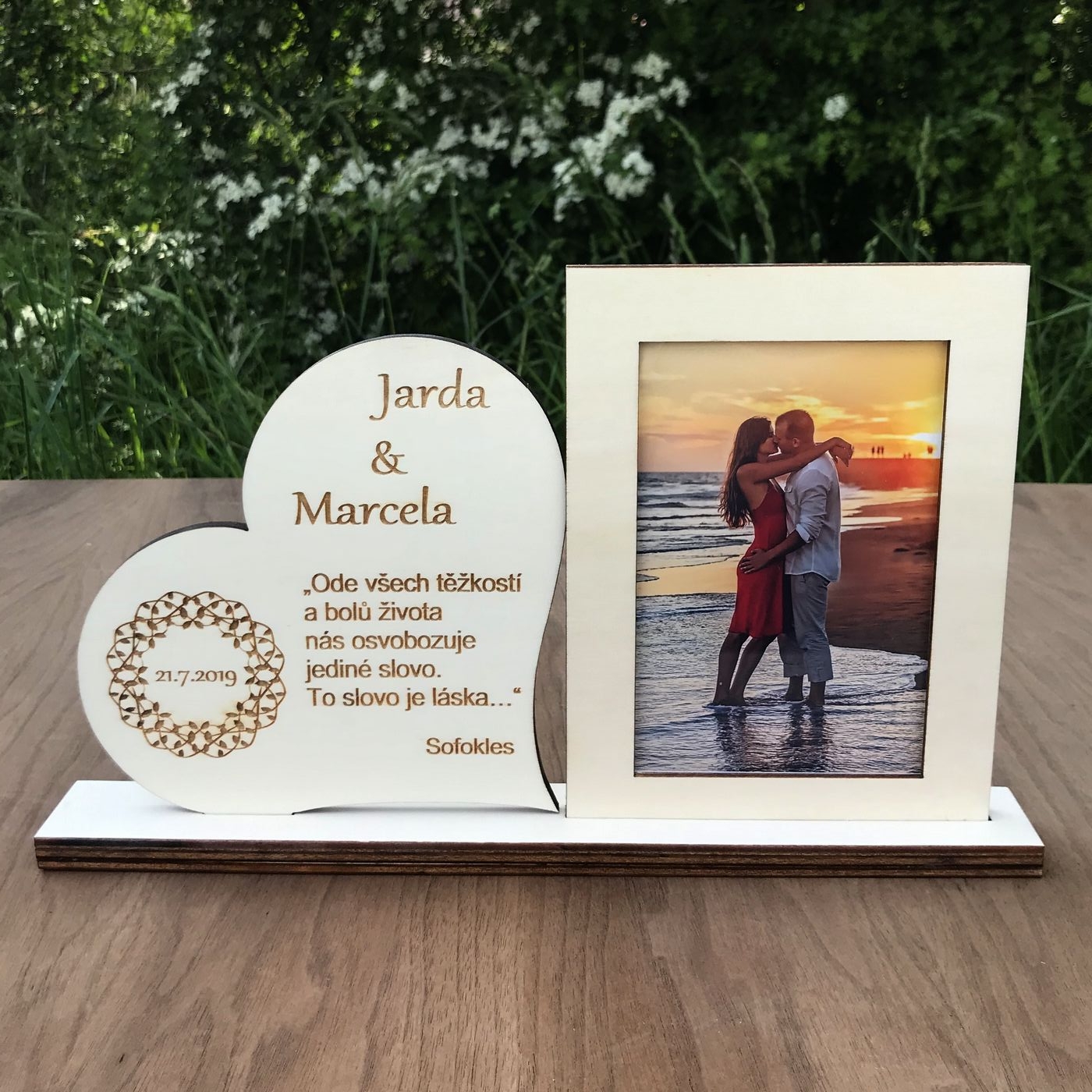 Rámeček na fotku o velikosti 15cm x 10cm a srdce s citátem. Na srdce Vám vyrobíme texty podle Vašeho přání. :-)