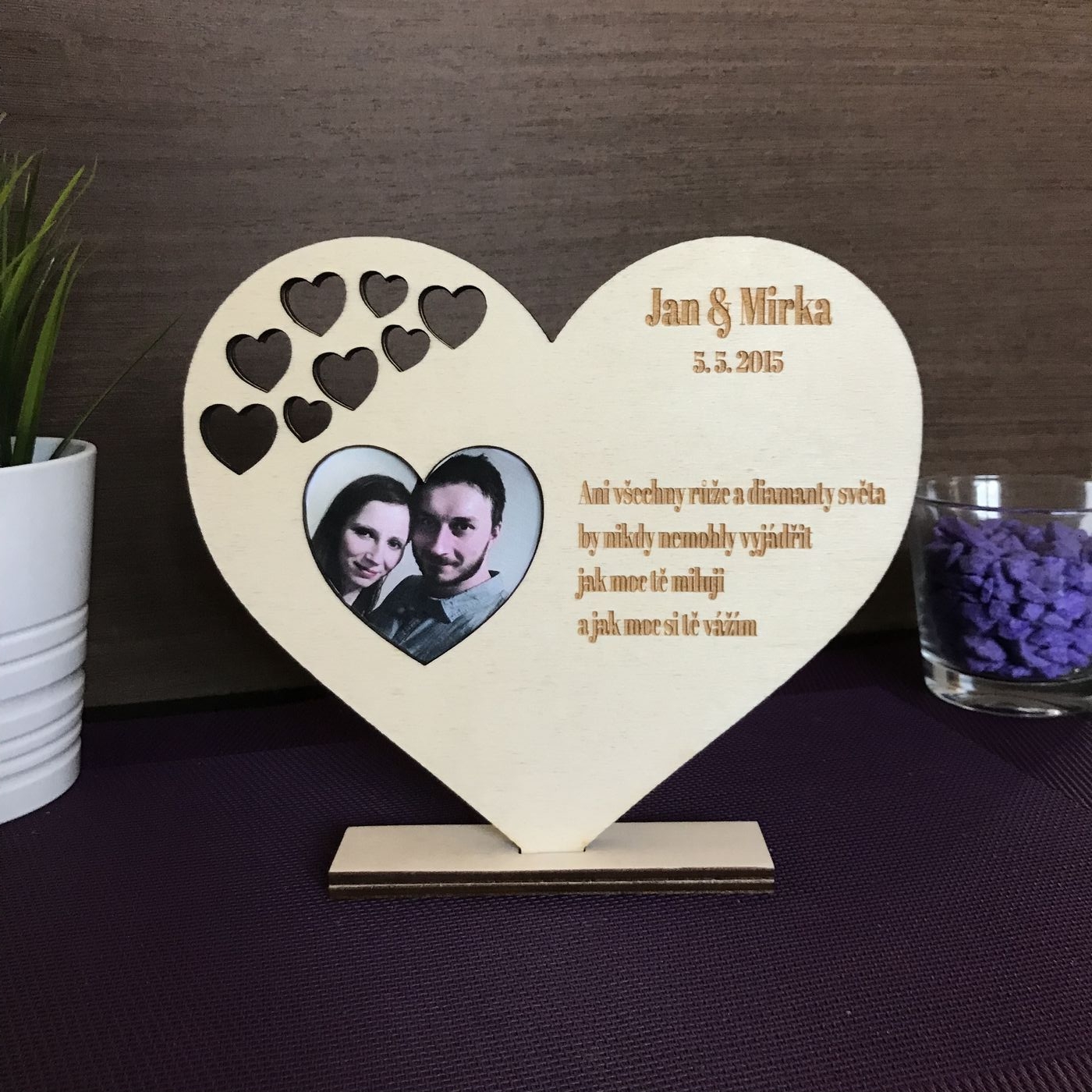 Srdce s citátem, jmény, datem a místem k nalepení fotky o rozměrech 20cm x 17,5cm.