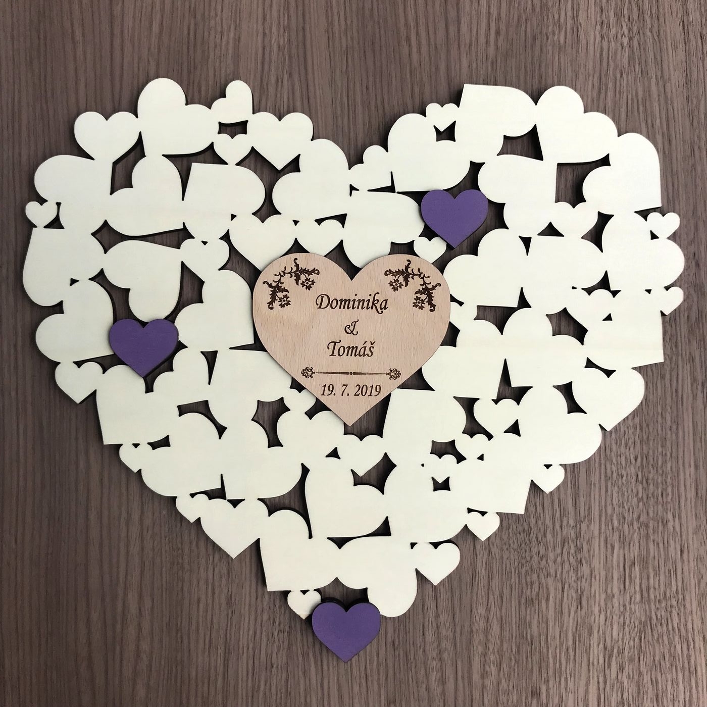 Vyřezávané srdce - kniha hostů (guestbook), velikost 40cm x 35cm. Na srdíčko uprostřed Vám vygravírujeme jména a datum podle Vašeho přání. :-)
