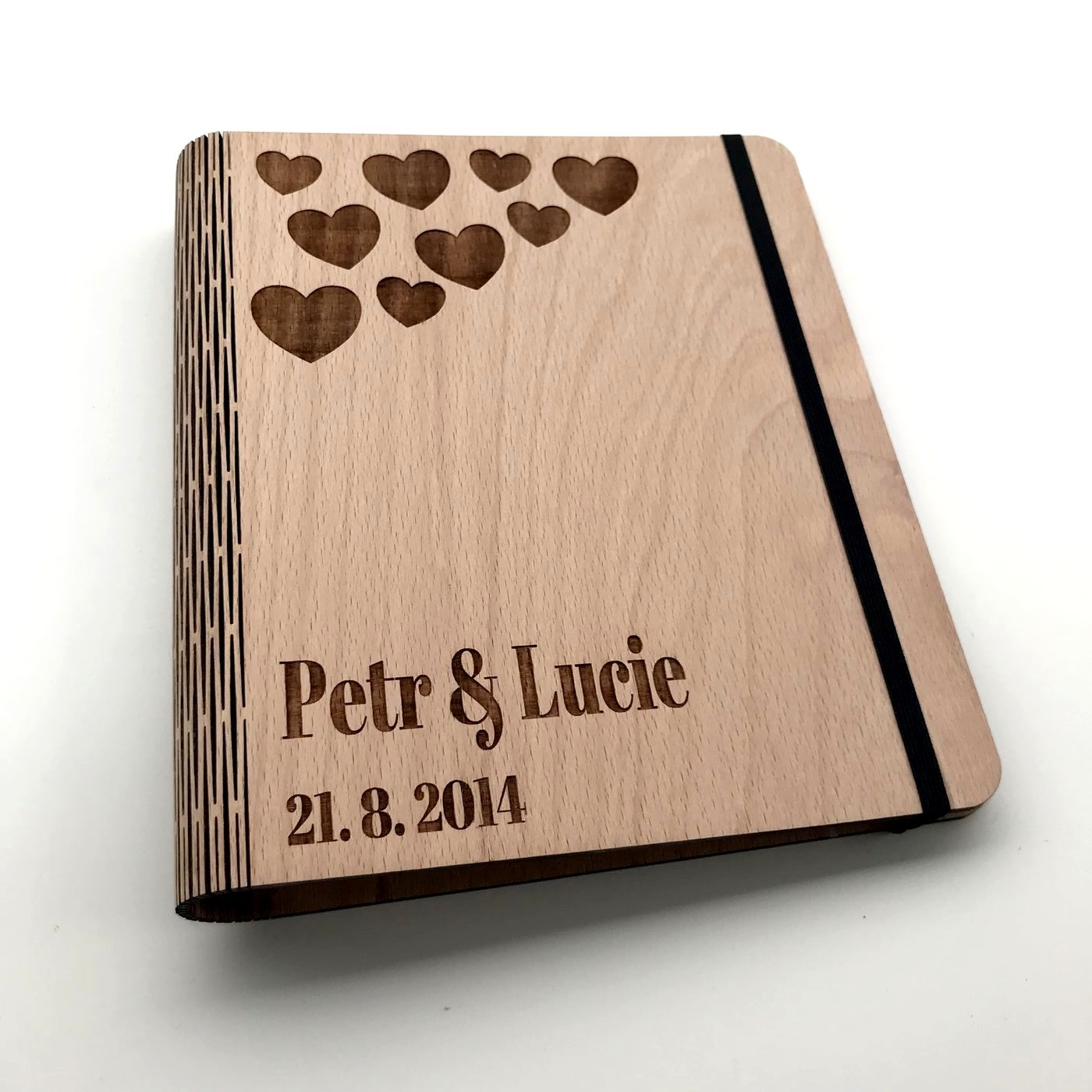 Dřevěný zápisník s unikátním dřevěným hřbetem. Velikost zápisníku 23cm x 20cm. Rozepínací vazba pro doplnění dalších listů. Dodáváno se 100 prázdnými listy velikosti A5. Text podle Vašeho přání. :-)